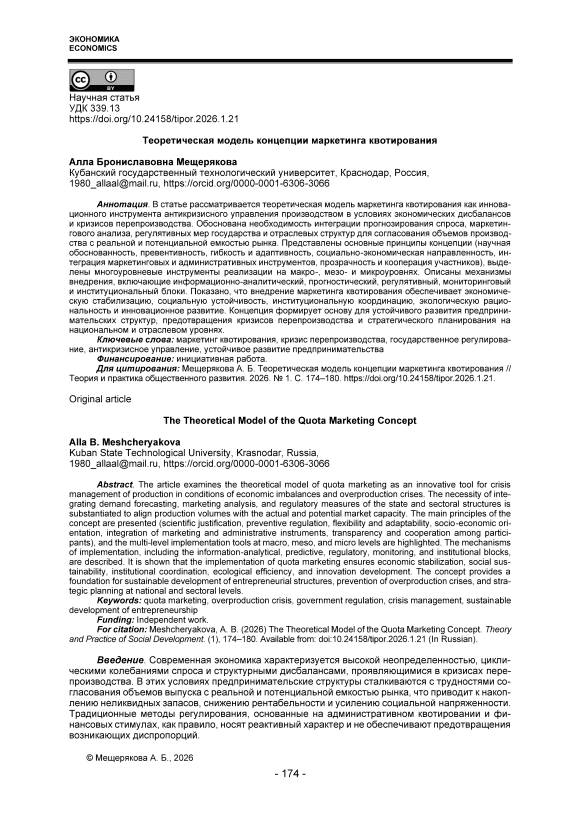 В статье рассматривается теоретическая модель маркетинга квотирования как инновационного инструмента антикризисного управления производством в условиях экономических дисбалансов и кризисов перепроизводства. Обоснована необходимость интеграции прогнозирования спроса, маркетингового анализа, регулятивных мер государства и отраслевых структур для согласования объемов производства с реальной и потенциальной емкостью рынка. Представлены основные принципы концепции (научная обоснованность, превентивность, гибкость и адаптивность, социально-экономическая направленность, интеграция маркетинговых и административных инструментов, прозрачность и кооперация участников), выделены многоуровневые инструменты реализации на макро-, мезо- и микроуровнях. Описаны механизмы внедрения, включающие информационно-аналитический, прогностический, регулятивный, мониторинговый и институциональный блоки. Показано, что внедрение маркетинга квотирования обеспечивает экономическую стабилизацию, социальную устойчивость, институциональную координацию, экологическую рациональность и инновационное развитие. Концепция формирует основу для устойчивого развития предпринимательских структур, предотвращения кризисов перепроизводства и стратегического планирования на национальном и отраслевом уровнях.
