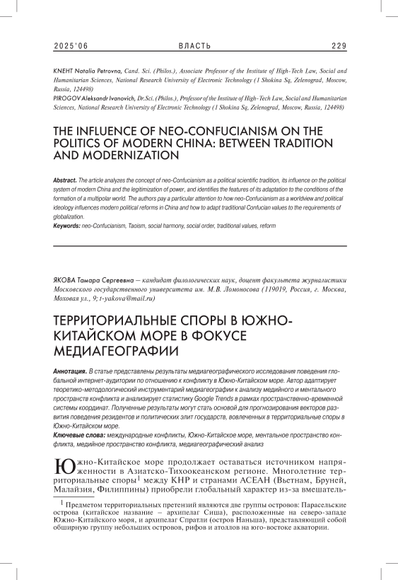 В статье представлены результаты медиагеографического исследования поведения глобальной интернет-аудитории по отношению к конфликту в Южно-Китайском море. Автор адаптирует теоретико-методологический инструментарий медиагеографии к анализу медийного и ментального пространств конфликта и анализирует статистику Google Trends в рамках пространственно-временной системы координат. Полученные результаты могут стать основой для прогнозирования векторов развития поведения резидентов и политических элит государств, вовлеченных в территориальные споры в Южно-Китайском море.