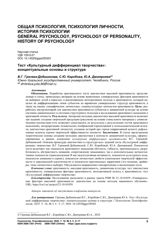 Обоснование. Разработка оригинального теста диагностики массовой креативности, представленная в статье, проводилась авторами на основе выявленных универсальных факторов креативности на выборках детей и взрослых и реализованном интегративном подходе к креативности, который нацелен на дифференциацию типов субъектов по вариантам универсальных структур креативности, а также на оценку специфических личностных, социокультурных контекстов креативности. Цель: разработать инструментарий для диагностики креативности субъектов в динамичной культуре на основе системно-динамического и системно-структурного подходов в исследовании креативного мышления и креативной личности. Результаты. Авторская методика диагностики массовой креативности включает три задания: создание творческой продукции (рисунков) на основе стимульного материала с символическими контекстами (что позволяет сопоставлять ее результаты с результатами тестов креативного мышления), интерпретацию человеческих изображений (проективный и психосемантический аспекты диагностики креативной личности), создание историй про героев (нарративный аспект); рефлексивные аспекты оценки творческой эффективности личности. Заключение. В статье представлены теоретические основы создания методики диагностики в контексте динамичной культуры, сформулированные в рамках концепции культурный дифференциал креативности В.Г. Грязевой-Добшинской. Описана процедура диагностики и структура всех заданий теста «Культурный дифференциал творчества» В.Г. Грязевой-Добшинской, С.Ю. Коробовой, Ю.А. Дмитриевой. Показатели теста включают как показатели креативного мышления (беглость, гибкость, оригинальность, разработанность, абстрактность названия, сопротивление замыканию), так и дополнительные метакогнитивные показатели (трансценденция Я как надситуативная активность, показатели культурного кода, показатели динамики в сериях), показатели личностных свойств (самооценки творческой эффективности и персональной идентичности) и показатели персональных нарративов (эго-позиции, драйверы, типы личностного выбора). Обсуждаются направления стандартизации и валидизации теста.