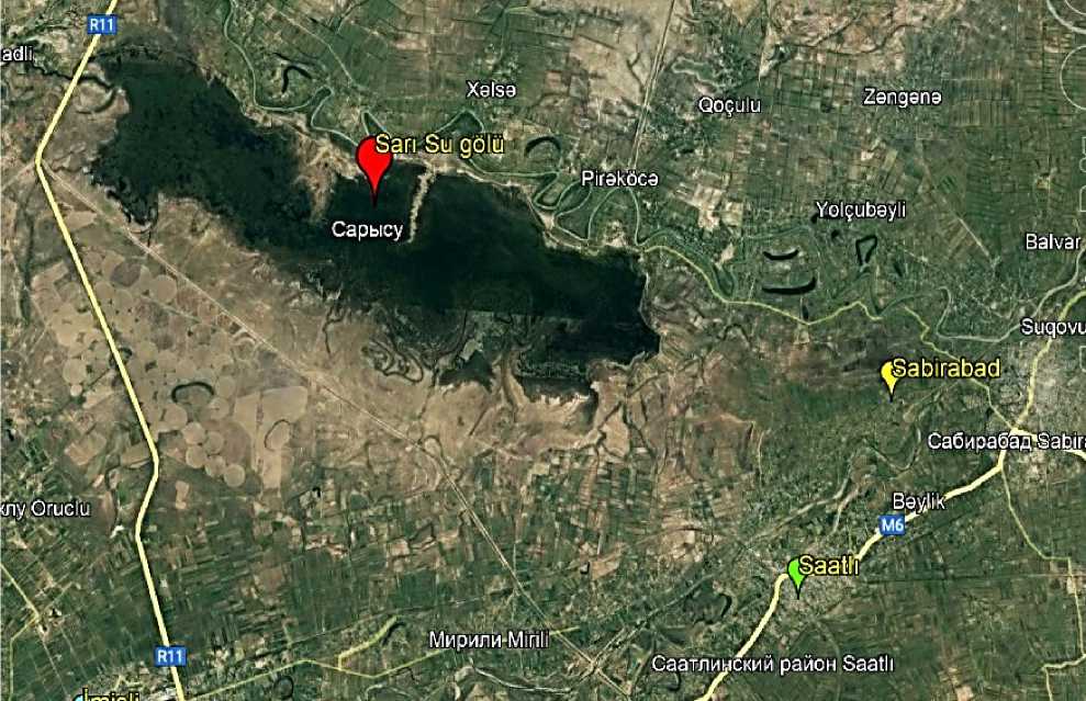 Lake Sarisu is one of the largest lakes in the Republic of Azerbaijan in terms of surface area and water volume. It is located along the banks of the Kur River within the territories of Imishli, Sabirabad, and Saatli districts and extends for approximately 22 km from northwest to southeast. Notably, Lake Sarisu is one of four interconnected lakes within the study area [7, 11].