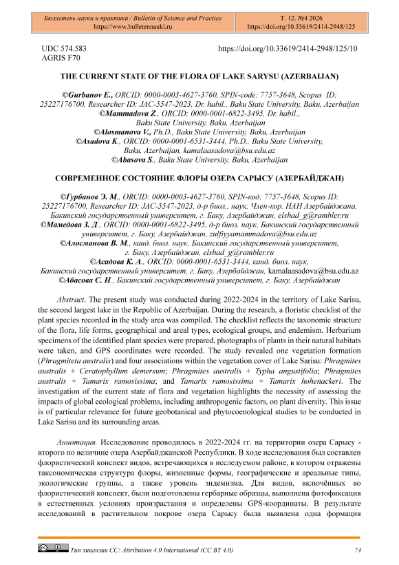 Исследование проводилось в 2022-2024 гг. на территории озера Сарысу - второго по величине озера Азербайджанской Республики. В ходе исследования был составлен флористический конспект видов, встречающихся в исследуемом районе, в котором отражены таксономическая структура флоры, жизненные формы, географические и ареальные типы, экологические группы, а также уровень эндемизма. Для видов, включённых во флористический конспект, были подготовлены гербарные образцы, выполнена фотофиксация в естественных условиях произрастания и определены GPS-координаты. В результате исследований в растительном покрове озера Сарысу была выявлена одна формация (Phragmiteta australis) и четыре ассоциации: Phragmites australis + Ceratophyllum demersum; Phragmites australis + Typha angustifolia; в прибрежной зоне — Phragmites australis + Tamarix ramosissima; Tamarix ramosissima + Tamarix hohenackeri. Изучение современного состояния видов, встречающихся во флоре и растительности исследуемой территории, подчёркивает необходимость оценки воздействия глобальных экологических проблем, в том числе антропогенных факторов. Это придаёт особую актуальность дальнейшим геоботаническим и фитосоциологическим исследованиям, планируемым на озере Сарысу и в прилегающих к нему территориях.