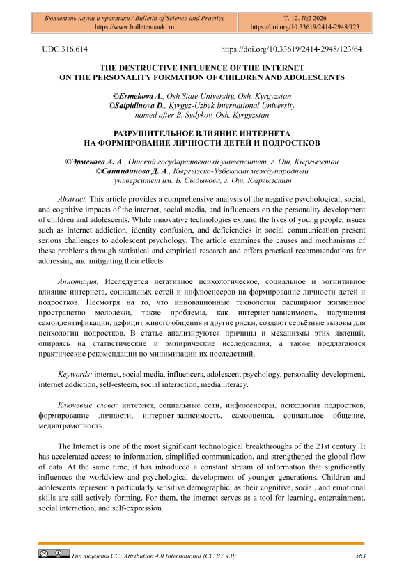 Internet addiction is becoming an increasingly prevalent issue, especially among adolescents, as virtual interactions start to replace real-life social connections. This shift negatively affects their social and cognitive development. Moreover, one of the most alarming trends observed globally — and increasingly in Kyrgyz society — is the erosion of face-to-face family communication. Not only children and teenagers, but also parents are becoming dependent on digital media. Rather than engaging in meaningful conversations with their children, many parents now spend considerable time on social media platforms [5].