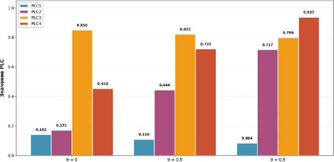 The influence of investor behavioural preferences on the final decision can be illustrated using the VIKOR method with probabilistic linguistic term sets [30]. As shown in Figure 1, when the parameter θ changes from 0 (conservative approach, focusing on minimizing individual regret) to 0.9 (aggressive approach, focusing on maximizing group utility), the Probabilistic Linguistic Compromise (PLC) values for alternatives change significantly [30]. At θ = 0, alternative PLC1 has a value of 0.142 and PLC4 — 0.453, whereas at θ = 0.9, these values are 0.084 and 0.937, respectively. This example demonstrates that investors with different risk preferences and strategic priorities can reach diametrically opposite conclusions when evaluating the same investment projects.