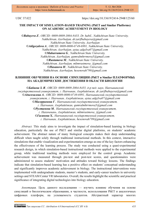 Цель данного исследования — изучить влияние обучения на основе симуляций в биологическом образовании, в частности, использования PhET и аналогичных цифровых платформ, на успеваемость студентов. Абстрактный характер многих биологических концепций затрудняет их глубокое понимание при преподавании исключительно традиционными методами. В этом контексте интерактивные симуляции, позволяющие визуализировать и экспериментировать, выступают одним из ключевых факторов, повышающих эффективность учебного процесса. Исследование проводилось с использованием квазиэкспериментального дизайна, в котором в экспериментальной группе применялись методы обучения на основе симуляций, а в контрольной группе — традиционные методы обучения. Успеваемость измерялась с помощью результатов предварительного и итогового тестирования, а для оценки мотивации и отношения студентов к урокам биологии использовались анкеты. Результаты показывают, что обучение на основе симуляций оказывает положительное влияние на понимание студентами концепций и значительно улучшает успеваемость по биологии. Учебные мероприятия проводились со студентами бакалавриата, магистратуры и начинающими преподавателями в университетских условиях и лабораториях виртуальной реальности STEAM-центров. В целом, результаты подчеркивают научную и практическую значимость интеграции цифровых технологий в биологическое образование.