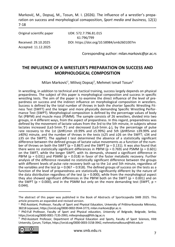 In wrestling, in addition to technical and tactical training, success largely depends on physical prepardness. The subject of this paper is morphological composition and success in specific wrestling tests. The aim of the paper is to examine the direct influence of the level of prepardness on success and the indirect influence on morphological composition in wrestlers. Success is defined by the total number of throws in both the shorter Specific Wrestling Fitness Test (SWFT) and the longer and more physically demanding Specific Wrestling Performance Test (SWPT). Morphological composition is defined by the percentage values of body fat (PBFM) and muscle mass (PSMM). The sample consists of 26 wrestlers, divided into two groups, in 4 different ways, from the aspect of prepardness. In this regard, preparedness was defined by the movement of lactate values from the 3rd to the 5th minute, in subjects whose lactates increased (La3-5min.↑) and decreased (La3-5min.↓), by the percentage of pulse rate recovery to the 1st (∆HR1min ≤9.99% and ≥5.99%) and 5th (∆HR5min ≤39.99% and ≥40%) minute, and the number of throws in the tests (≤25 and ≥26 on the SWFT; ≤34 and ≥35 on the SWPT). The applied t test determined the absence of a statistically significant difference between the defined groups of lactate value movements as a function of the number of throws on both the SWFT (p = 0.867) and the SWPT (p = 0.131). It was also found that there were no statistically significant differences in PBFM (p = 0.769) and PSMM (p = 0.601) on the SWFT, while the longer SWPT, with its demands, showed a significant difference in PBFM (p = 0.031) and PSMM (p = 0.018) in favor of the faster metabolic recovery. Further analysis of the difference revealed no statistically significant difference between the groups with different levels of pulse rate recovery both up to the 1st and 5th minute, regardless of the variables and the test (p = 0.067 – 0.918). The defined groups of success on the tests as a function of the level of preparedness are statistically significantly different by the nature of the data distribution regardless of the test (p = 0.000), while from the morphological aspect they also showed significant differences in the PBFM both on the SWFT (p = 0.001) and on the SWPT (p = 0.000), and in the PSMM but only on the more demanding test (SWPT, p = 0.044). In wrestling, in addition to technical and tactical training, success largely depends on physical prepardness. The subject of this paper is morphological composition and success in specific wrestling tests. The aim of the paper is to examine the direct influence of the level of prepardness on success and the indirect influence on morphological composition in wrestlers. Success is defined by the total number of throws in both the shorter Specific Wrestling Fitness Test (SWFT) and the longer and more physically demanding Specific Wrestling Performance Test (SWPT). Morphological composition is defined by the percentage values of body fat (PBFM) and muscle mass (PSMM). The sample consists of 26 wrestlers, divided into two groups, in 4 different ways, from the aspect of prepardness. In this regard, preparedness was defined by the movement of lactate values from the 3rd to the 5th minute, in subjects whose lactates increased (La3-5min.↑) and decreased (La3-5min.↓), by the percentage of pulse rate recovery to the 1st (∆HR1min ≤9.99% and ≥5.99%) and 5th (∆HR5min ≤39.99% and ≥40%) minute, and the number of throws in the tests (≤25 and ≥26 on the SWFT; ≤34 and ≥35 on the SWPT). The applied t test determined the absence of a statistically significant difference between the defined groups of lactate value movements as a function of the number of throws on both the SWFT (p = 0.867) and the SWPT (p = 0.131). It was also found that there were no statistically significant differences in PBFM (p = 0.769) and PSMM (p = 0.601) on the SWFT, while the longer SWPT, with its demands, showed a significant difference in PBFM (p = 0.031) and PSMM (p = 0.018) in favor of the faster metabolic recovery. Further analysis of the difference revealed no statistically significant difference between the groups with different levels of pulse rate recovery both up to the 1st and 5th minute, regardless of the variables and the test (p = 0.067 – 0.918). The defined groups of success on the tests as a function of the level of preparedness are statistically significantly different by the nature of the data distribution regardless of the test (p = 0.000), while from the morphological aspect they also showed significant differences in the PBFM both on the SWFT (p = 0.001) and on the SWPT (p = 0.000), and in the PSMM but only on the more demanding test (SWPT, p = 0.044).
