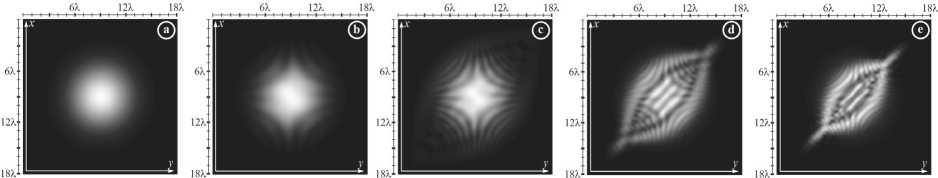 Fig. 1. The input beams, at different values of a, intensity: a) a = 0, b) a = 35.99, c) a = 71.98, d) a = 107.98, e) a = 141.68