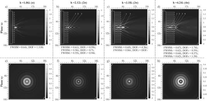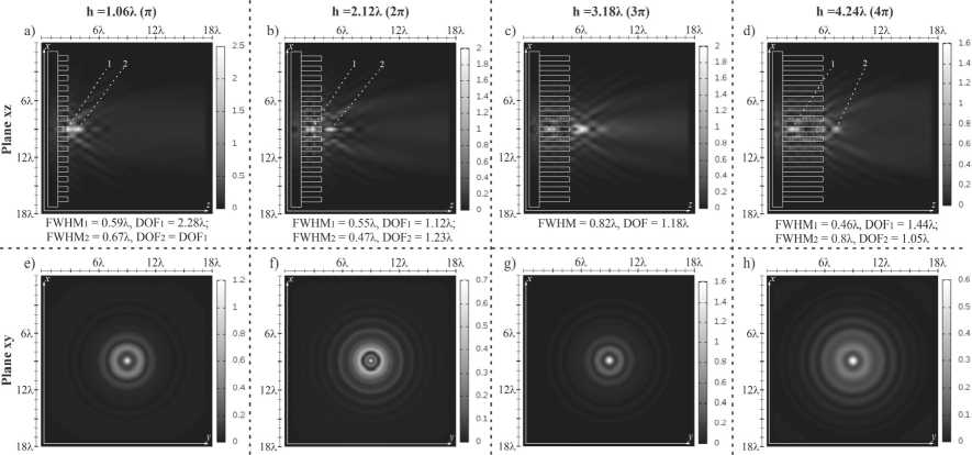 Let I – be the intensity value from the maximum value on the optical axis, which is 100 %. Then, at h = 1.06λ, the maximum outside the element is I = 97.73 %, at h = 2.12λ, for the maximum outside the element, I = 87.6 %, and for h = 4.24λ, the maximum outside the element is I = 71.9 %. The minimum focal spot size outside the element was obtained for the case h = 2.12λ (FWHM = 0.47λ), the maximum light needle – for the case h = 1.06λ (DOF = 2.28λ).