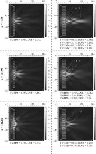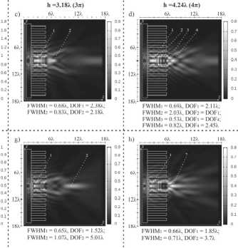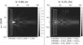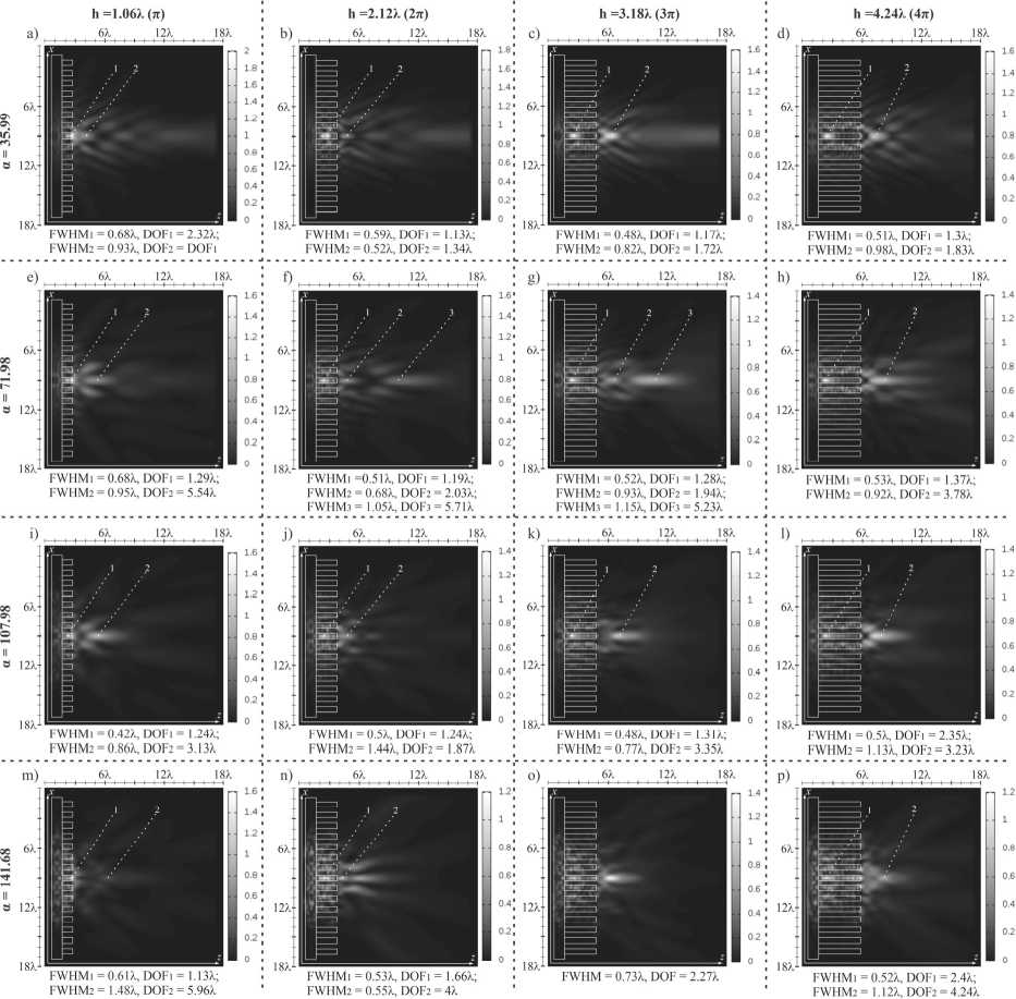 It should be noted that the main maxima are formed inside the element as before, only for the case of h = 3.18λ at α = 141.68 (Fig. 4 o ) the formation of the main maximum is observed outside the ring grating with FWHM = 0.73λ and DOF = 2.27λ.