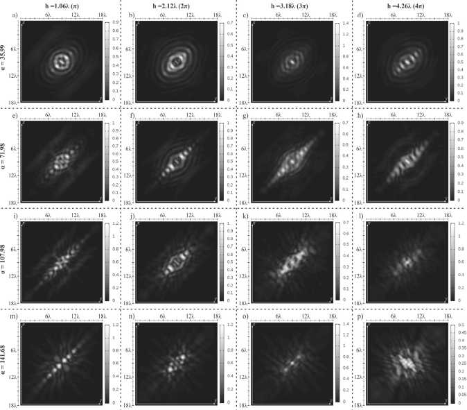 Fig. 5. The sections in the xyplane (intensity) at a distance S = 1.5 Z , with a = 35.99 (a, b, c, d), a = 71.98 (e, f, g, h), a = 107.98 (i, j, k, l), a = 141.68 (m, n, o, p)