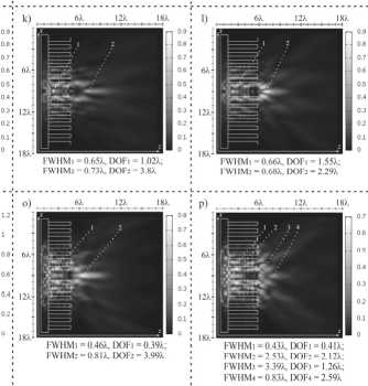 The minimum focal spot size was obtained for the case of h = 4.24Z, a =141.68 (FWHM = 0.43Z, I = 100 %, Fig. 6 p ), and light needles larger than 4 Z were observed for the cases of h = 3.18Z, a = 71.8 (DOF = 5.01Z, I =71.1 %, Fig. 6 g ), h = 1.06Z, a =107.98 (DOF = 4.86Z, I =100%, Fig. 6 i ) and h = 2.12Z, a = 71.98 (DOF = 4.44Z, I =73.2%, Fig. 6 f).