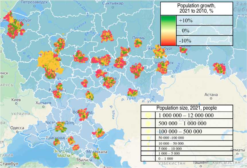 Figure 1. Population size and its dynamics in settlements of urban agglomerations in western Russia for 2010–2021