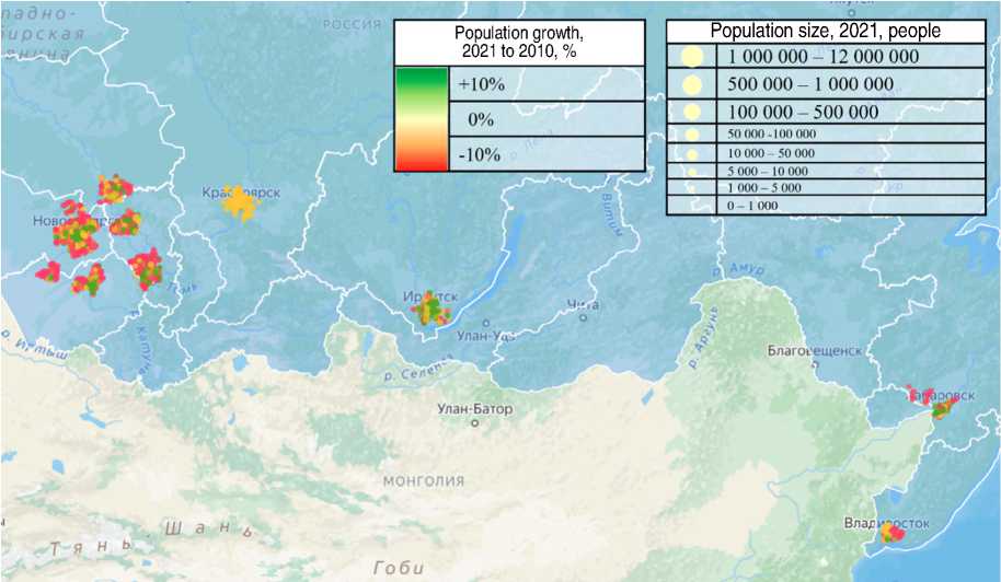 Figure 2. Population size and its dynamics in settlements of urban agglomerations in eastern Russia for 2010–2021
