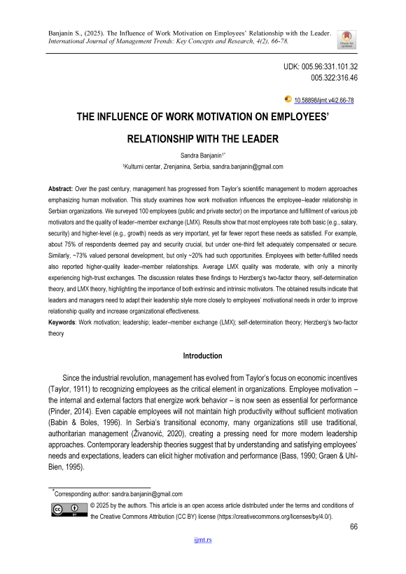 Over the past century, management has progressed from Taylor’s scientific management to modern approaches emphasizing human motivation. This study examines how work motivation influences the employee–leader relationship in Serbian organizations. We surveyed 100 employees (public and private sector) on the importance and fulfillment of various job motivators and the quality of leader–member exchange (LMX). Results show that most employees rate both basic (e.g., salary, security) and higher-level (e.g., growth) needs as very important, yet far fewer report these needs as satisfied. For example, about 75% of respondents deemed pay and security crucial, but under one-third felt adequately compensated or secure. Similarly, ~73% valued personal development, but only ~20% had such opportunities. Employees with better-fulfilled needs also reported higher-quality leader–member relationships. Average LMX quality was moderate, with only a minority experiencing high-trust exchanges. The discussion relates these findings to Herzberg’s two-factor theory, self-determination theory, and LMX theory, highlighting the importance of both extrinsic and intrinsic motivators. The obtained results indicate that leaders and managers need to adapt their leadership style more closely to employees’ motivational needs in order to improve relationship quality and increase organizational effectiveness.