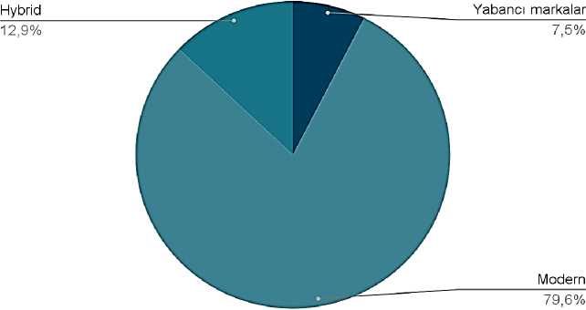 Figure presents the percentage distribution of outdoor advertisements that include national identity indicators according to their presentation forms. The findings reveal that national identity indicators are predominantly represented through modern presentation forms (79.6%). This is followed by hybrid presentations, in which traditional and modern elements are used together (12.9%). The traditional presentation form is the least frequently employed (7.5%). Overall, the table indicates that national identity in outdoor advertising is mainly conveyed through modern representational strategies.