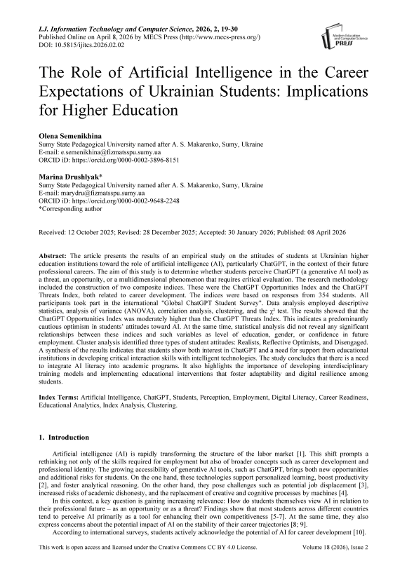 Artificial Intelligence, ChatGPT, Students, Perception, Employment, Digital Literacy, Career Readiness, Educational Analytics, Index Analysis, Clustering