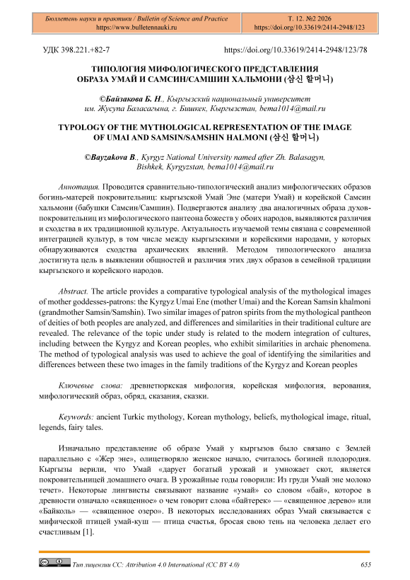Проводится сравнительно-типологический анализ мифологических образов богинь-матерей покровительниц: кыргызской Умай Эне (матери Умай) и корейской Самсин хальмони (бабушки Самсин/Самшин). Подвергаются анализу два аналогичных образа духов-покровительниц из мифологического пантеона божеств у обоих народов, выявляются различия и сходства в их традиционной культуре. Актуальность изучаемой темы связана с современной интеграцией культур, в том числе между кыргызскими и корейскими народами, у которых обнаруживаются сходства архаических явлений. Методом типологического анализа достигнута цель в выявлении общностей и различия этих двух образов в семейной традиции кыргызского и корейского народов.