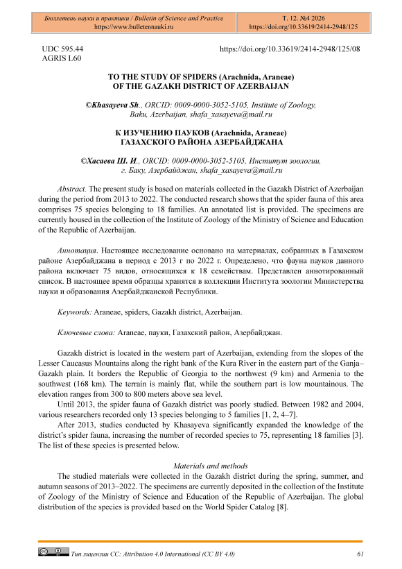 Текст научной статьи To the Study of Spiders (Arachnida, Araneae) of the Gazakh District of Azerbaijan