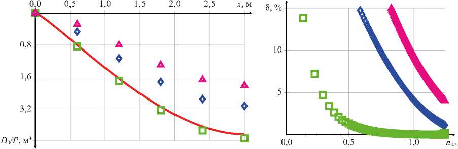 Результаты расчёта при действии распределённой нагрузки, приведённые на рис. 10 и 11 для примера 3, аналогичны приведённым на рис. 6 и 7 для примера 1. Основным отличием является то, что точность результатов при использовании приближённой матрицы (11) и при дискретной аппроксимации уменьшилась. Таким образом, можно сделать вывод, что на результаты расчёта влияет не только матрица жёсткости — точная или приближённая — но и вектор узло- вых сил от распределённых нагрузок.