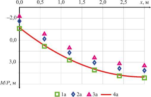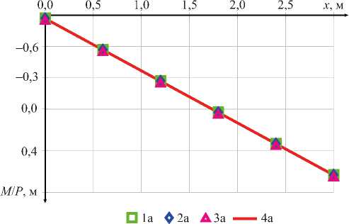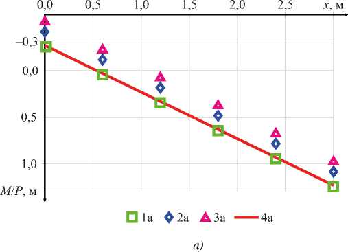 а — результаты вычисления изгибающих моментов M в зависимости от x ; б — погрешность вычисления в зависимости от числа конечных элементов; 1 а , 1 б — линейная аппроксимация и точная матрица жесткости (27);