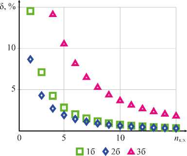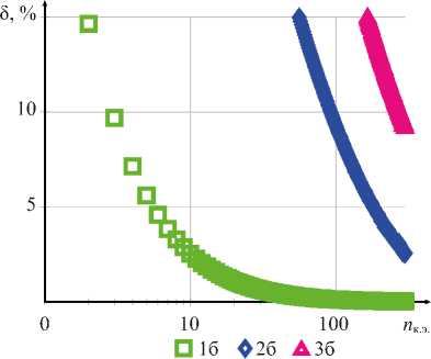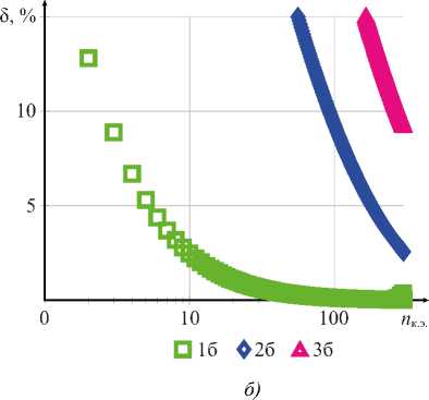 б — погрешность вычисления в зависимости от числа конечных элементов. 1 а , 1 б — линейная аппроксимация и точная матрица жесткости (27); 2 а , 2 б — линейная аппроксимация и приближенная матрица жесткости (11); 3 а , 3 б — дискретная аппроксимация; 4 а — результаты аналитического расчета