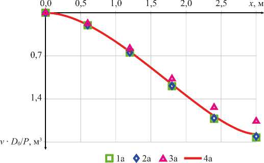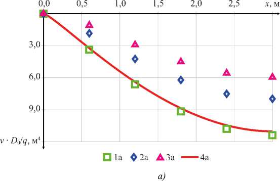 Рис. 8. Результаты вычисления прогибов для примера 2: а — результаты вычисления прогибов v в зависимости от x ;