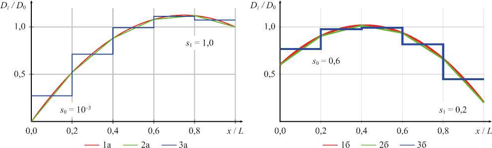 Решение уравнения (20) с граничными условиями (34) и законом изменения жесткости (36) найдено аналитически для рассматриваемых значений s 0 и s 1 . Ввиду громоздкости данное решение здесь не приведено. Для произвольных значений s 0 и s 1 аналитическое решение получить не удалось.