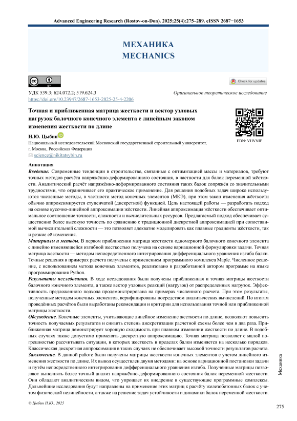 Введение. Современные тенденции в строительстве, связанные с оптимизацией массы и материалов, требуют точных методов расчёта напряжённо-деформированного состояния, в частности для балок переменной жёсткости. Аналитический расчёт напряжённо-деформированного состояния таких балок сопряжён со значительными трудностями, что ограничивает его практическое применение. Для решения подобных задач широко используются численные методы, в частности метод конечных элементов (МКЭ), при этом закон изменения жёсткости обычно аппроксимируется ступенчатой (дискретной) функцией. Цель настоящей работы — разработать подход на основе кусочно-линейной аппроксимации жёсткости. Линейная аппроксимация жёсткости обеспечивает оптимальное соотношение точности, сложности и вычислительных ресурсов. Предлагаемый подход обеспечивает существенно более высокую точность по сравнению с традиционной дискретной аппроксимацией при сопоставимой вычислительной сложности — это позволяет адекватно моделировать как плавные градиенты жёсткости, так и резкие её изменения. Материалы и методы. В первом приближении матрица жесткости одномерного балочного конечного элемента с линейно изменяющейся изгибной жесткостью получена на основе вариационной формулировки задачи. Точная матрица жесткости — методом непосредственного интегрирования дифференциального уравнения изгиба балки. Точные решения в примерах расчета получены с применением программного комплекса Maple. Численное решение, с использованием метода конечных элементов, реализовано в разработанной автором программе на языке программирования Python. Результаты исследования. В ходе исследования были получены приближенная и точная матрицы жесткости балочного конечного элемента, а также вектор узловых реакций (нагрузок) от распределенных нагрузок. Эффективность предложенного подхода продемонстрирована на примерах численного расчета. При этом результаты, полученные методом конечных элементов, верифицированы посредством аналитических вычислений. По итогам проведённых расчётов были выработаны рекомендации и критерии для использования точной или приближенной матрицы жесткости. Обсуждение. Конечные элементы, учитывающие линейное изменение жесткости по длине, позволяют повысить точность получаемых результатов и снизить степень дискретизации расчетной схемы более чем в два раза. Приближенная матрица демонстрирует хорошую сходимость при плавном изменении жесткости по длине. В подобных случаях также допустимо применять дискретную аппроксимацию. Точная матрица позволяет с малой погрешностью рассчитывать ситуации, в которых жесткость в пределах балки изменяется на несколько порядков. Классическая дискретная аппроксимация в таких случаях не обеспечивает высокой точности результатов расчета. Заключение. В данной работе были получены матрицы жесткости конечных элементов с учетом линейного изменения жесткости по длине. Их вывод осуществлен двумя методами: на основе вариационной постановки задачи и путём непосредственного интегрирования дифференциального уравнения изгиба. Полученные матрицы позволяют выполнять более точный анализ напряжённо-деформированного состояния балок переменной жесткости. Они обладают аналитическим видом, что упрощает их внедрение в существующие прог