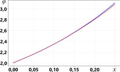 Произведем сравнение графиков решений исходной и упрощенной задачи, полагая A = 4, С = 2, D = 1, то есть уравнение (8) примет вид d^ = (- y2 + 2х2 + 2x + 1)y + 4x + 2, причем для это-dx2 2