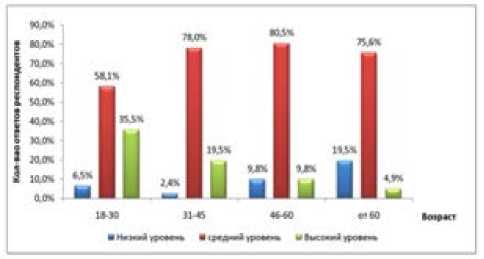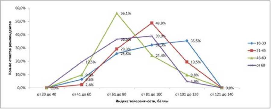 Рис. 1. Распределение ответов респондентов Рис. 2. Распределение среднего индекса по возрастным группам и уровням толерантности толерантности по возрастным группам