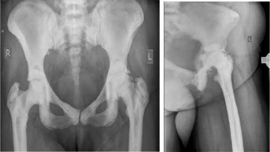 Рисунок 1. Обзорная рентгенограмма костей таза и левого тазобедренного сустава до оперативного вмешательства