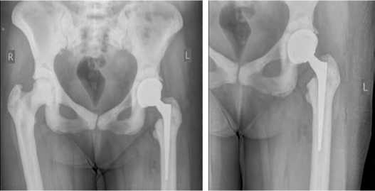 Далее произведено формирование посадочного места для бедренного компонента эндопротеза. Канал бедренной кости отсутствовал и был полностью замещен компактной костью. Путем поэтапного рассверливания костномозгового канала сверлами и последовательной обработки развертками, удалось сформировать место посадки бедренного компонента. Выполнено пробное вправление и установка пресс-фит бедренного компонента эндопротеза с головкой. Произведено послойное ушивание раны, наложение асептической повязки. Интраоперационная кровопотеря – 150 мл, гемотрансфузия не проводилась.