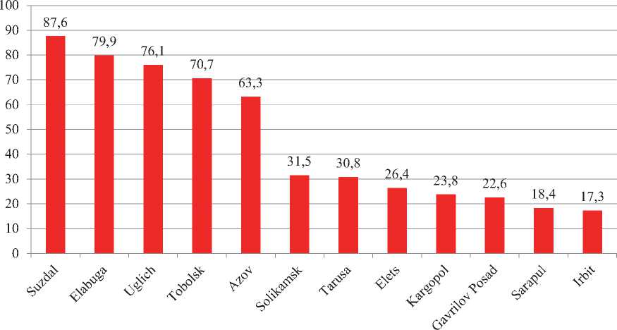 Convertng into a scale that is easy to understand (from 0 to 100 %) made it possible to obtain index assessments for all 12 selected small towns (Fig. 1).