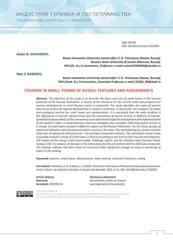 The objective of the study is to describe the place and role of small towns in the tourism potential of the Russian Federation. A review of the literature on the current state and prospects for tourism development in small Russian towns is conducted. The study identifies the types of tourism that act as drivers of regional development in modern conditions. In particular, the prospects of estate and ecological tourism for small towns are substantiated. It is concluded that the main problem is the differences in tourism infrastructure and the unevenness of tourist activity in different territories. Quantitative assessments of this unevenness were obtained through the development and implementation of the author’s index. A comprehensive statistical database was compiled, reflecting tourist activity in a sample of small towns located in different regions of the Russian Federation. On this basis, groups of statistical indicators were formed and used to construct the index. The methodology for constructing the index was an advanced statistical tool – the principal component analysis. The calculation results made it possible to build a rating of small towns in Russia according to the level of their tourism development. The leaders of the rating in 2023 were Suzdal, Yelabuga, Uglich, and the outsiders were Gavrilov Posad, Sarapul, Irbit. An analysis of changes in the index values for the period from 2019 to 2023 was conducted. The findings indicate that there were no structural shifts significant enough to cause a reordering of towns in the ranking.