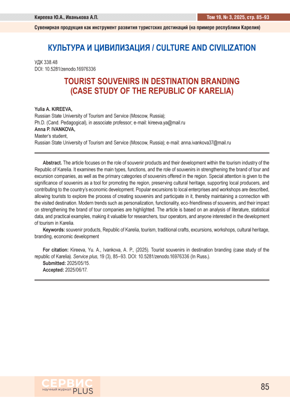 The article focuses on the role of souvenir products and their development within the tourism industry of the Republic of Karelia. It examines the main types, functions, and the role of souvenirs in strengthening the brand of tour and excursion companies, as well as the primary categories of souvenirs offered in the region. Special attention is given to the significance of souvenirs as a tool for promoting the region, preserving cultural heritage, supporting local producers, and contributing to the country’s economic development. Popular excursions to local enterprises and workshops are described, allowing tourists to explore the process of creating souvenirs and participate in it, thereby maintaining a connection with the visited destination. Modern trends such as personalization, functionality, eco-friendliness of souvenirs, and their impact on strengthening the brand of tour companies are highlighted. The article is based on an analysis of literature, statistical data, and practical examples, making it valuable for researchers, tour operators, and anyone interested in the development of tourism in Karelia.
