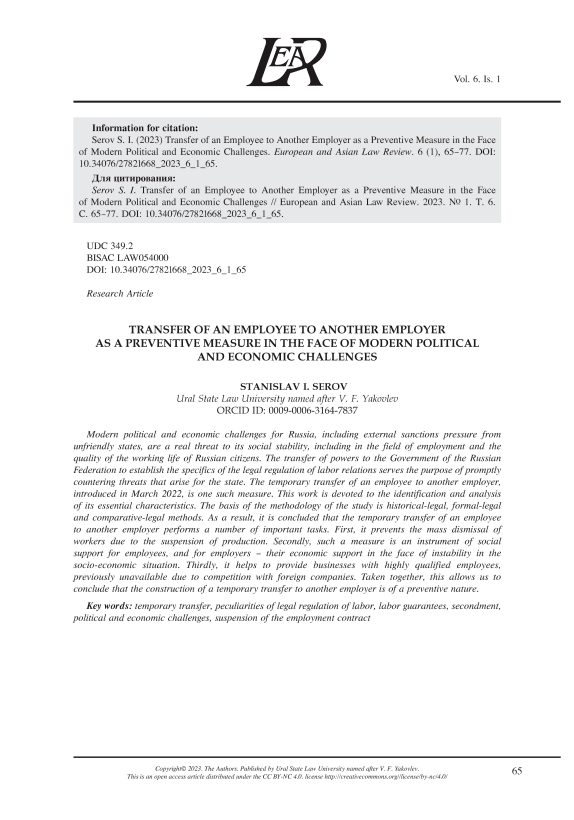 The use of the construction of a temporary transfer to another employer with the suspension of an employment contract as a method of overcoming the consequences of the economic crisis for employers and ensuring migration security and employment was considered even before the onset of the political and economic challenges that are mentioned in this study [Orlovskii, 2009; Vishnyakova, 2018:140; Zaitseva & Luzina, 2019:181; Klepalova, 2022:65; Skachkova, 2022:175-176].