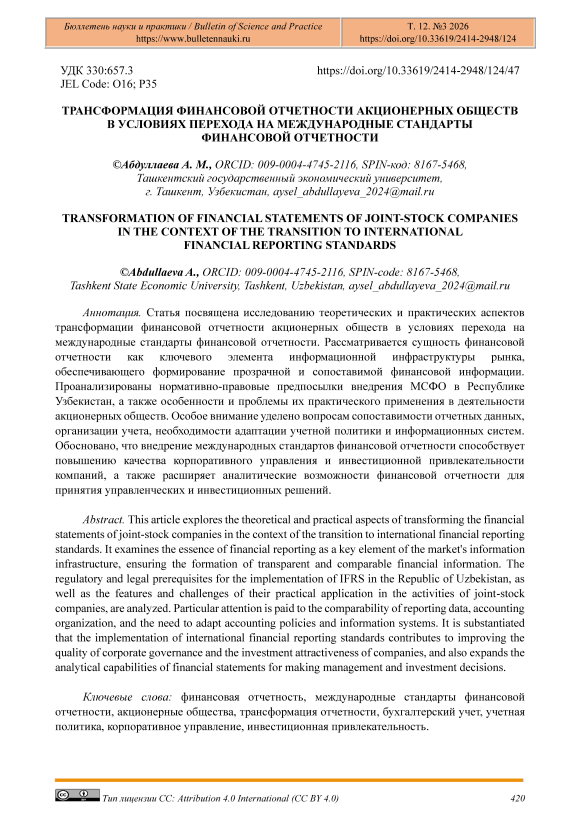 Статья посвящена исследованию теоретических и практических аспектов трансформации финансовой отчетности акционерных обществ в условиях перехода на международные стандарты финансовой отчетности. Рассматривается сущность финансовой отчетности как ключевого элемента информационной инфраструктуры рынка, обеспечивающего формирование прозрачной и сопоставимой финансовой информации. Проанализированы нормативно-правовые предпосылки внедрения МСФО в Республике Узбекистан, а также особенности и проблемы их практического применения в деятельности акционерных обществ. Особое внимание уделено вопросам сопоставимости отчетных данных, организации учета, необходимости адаптации учетной политики и информационных систем. Обосновано, что внедрение международных стандартов финансовой отчетности способствует повышению качества корпоративного управления и инвестиционной привлекательности компаний, а также расширяет аналитические возможности финансовой отчетности для принятия управленческих и инвестиционных решений.