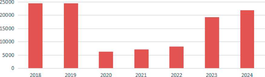Анализируя данные рис. 2, можно отметить, что, несмотря на введенные в 2022 году санкции, в 2023–2024 гг. наблюдалась положительная динамика въездного туристского потока, что характеризует определенную стабилизацию рынка гостиничных услуг после длительного периода нестабильности, вызванного пандемией и началом СВО.2