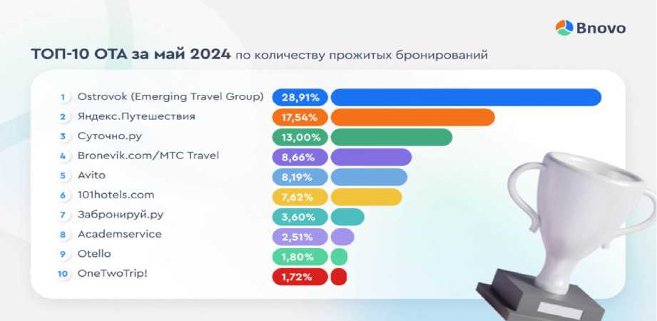 В 2022 году наблюдалось значительное увеличение доли прямых продаж, осуществляемых через официальные сайты гостиниц, что привело к росту доходов с этих платформ. Хотя эти доходы оказались выше, чем от продаж через агентов, они все же не достигли объемов, которые ранее обеспечивали зарубежные онлайн-турагентства. Этот переломный момент стимулировал отельеров к активизации усилий по развитию многоканальных продаж и укреплению позиций в прямом бронировании. События того периода также способствовали усилению доверия к официальным сайтам отелей. На фоне данных изменений на рынке заметно выросли возможности для развития российских ОТА и метапоисковых сервисов. Среди лидеров по числу бронирований выделяются Ostrovok.ru, Яндекс.Путешествия, «Суточно.ру», Bronevik.com, которые, наряду с другими сервисами, демонстрируют значительный рост и популярность, подтверждая свою востребованность среди партнеров и клиентов.