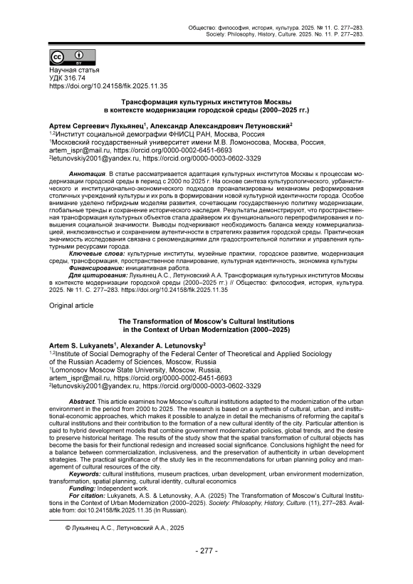 Текст научной статьи Трансформация культурных институтов Москвы в контексте модернизации городской среды (2000–2025 гг.)