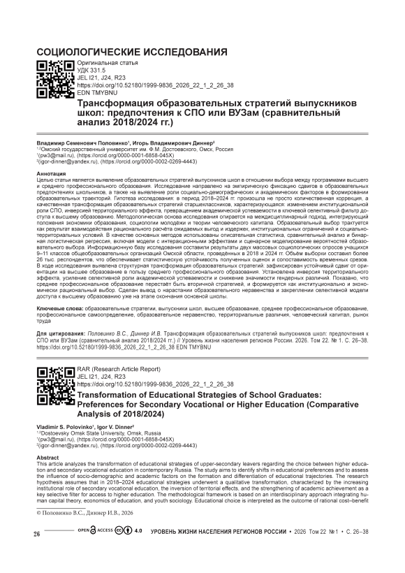 Целью статьи является выявление образовательных стратегий выпускников школ в отношении выбора между программами высшего и среднего профессионального образования. Исследование направлено на эмпирическую фиксацию сдвигов в образовательных предпочтениях школьников, а также на выявление роли социально-демографических и академических факторов в формировании образовательных траекторий. Гипотеза исследования: в период 2018–2024 гг. произошла не просто количественная коррекция, а качественная трансформация образовательных стратегий старшеклассников, характеризующаяся: изменением институциональной роли СПО, инверсией территориального эффекта, превращением академической успеваемости в ключевой селективный фильтр доступа к высшему образованию. Методологическая основа исследования опирается на междисциплинарный подход, интегрирующий положения экономики образования, социологии молодёжи и теории человеческого капитала. Образовательный выбор трактуется как результат взаимодействия рационального расчёта ожидаемых выгод и издержек, институциональных ограничений и социально-территориальных условий. В качестве основных методов использованы описательная статистика, сравнительный анализ и бинарная логистическая регрессия, включая модели с интеракционными эффектами и сценарное моделирование вероятностей образовательного выбора. Информационную базу исследования составили результаты двух массовых социологических опросов учащихся 9–11 классов общеобразовательных организаций Омской области, проведённых в 2018 и 2024 гг. Объём выборки составил более 26 тыс. респондентов, что обеспечивает статистическую устойчивость полученных оценок и сопоставимость временных срезов. В ходе исследования выявлена структурная трансформация образовательных стратегий: зафиксирован устойчивый сдвиг от ориентации на высшее образование в пользу среднего профессионального образования. Установлена инверсия территориального эффекта, усиление селективной роли академической успеваемости и снижение значимости гендерных различий. Показано, что среднее профессиональное образование перестает быть вторичной стратегией и формируется как институционально и экономически рациональный выбор. Сделан вывод о нарастании образовательного неравенства и закреплении селективной модели доступа к высшему образованию уже на этапе окончания основной школы.