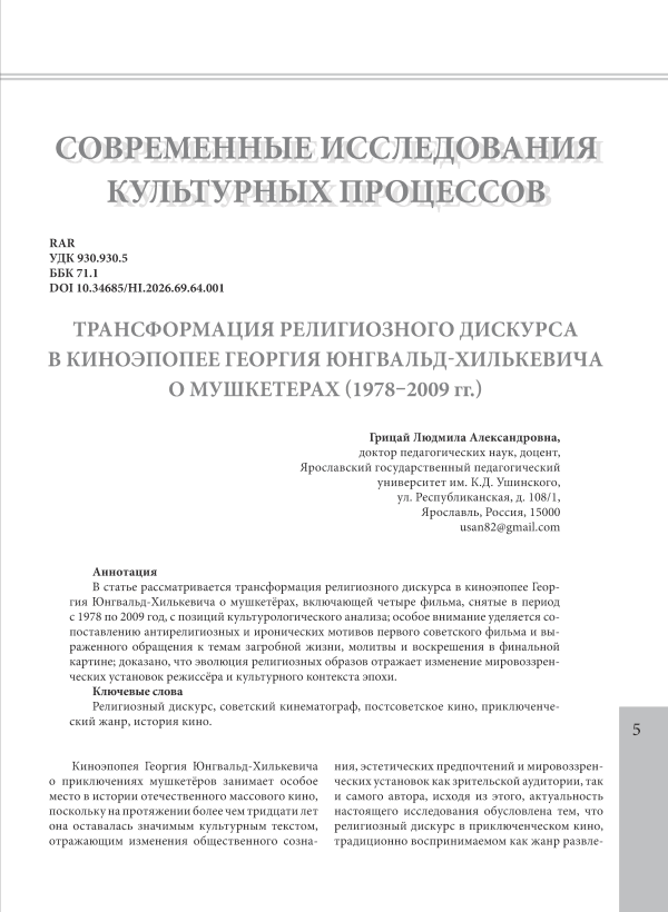 Киноэпопея Георгия Юнгвальд-Хилькевича о приключениях мушкетёров занимает особое место в истории отечественного массового кино, поскольку на протяжении более чем тридцати лет она оставалась значимым культурным текстом, отражающим изменения общественного созна- ния, эстетических предпочтений и мировоззренческих установок как зрительской аудитории, так и самого автора, исходя из этого, актуальность настоящего исследования обусловлена тем, что религиозный дискурс в приключенческом кино, традиционно воспринимаемом как жанр развле-