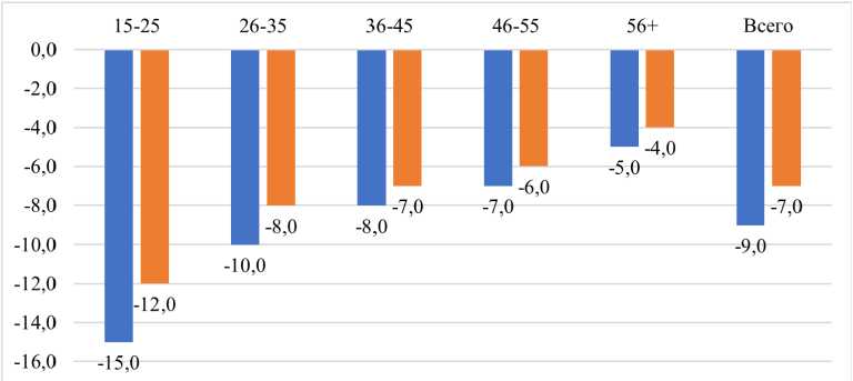 Рис. 1 / Fig 1. Сокращение выхода на работу среди работников в Узбекистане в периоды экстремальной жары в разбивке по возрастным группам, 2018-2024 годы [10] / Reduction in attendance at work among workers in Uzbekistan during heat waves, by age group, 2018–2024 [10]