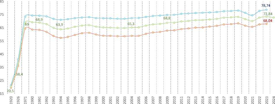 Рис. 1. Ожидаемая продолжительность жизни при рождении в России за период с 1920 по 2024 год, лет