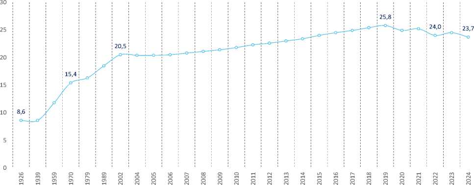 Наше государство не входит в список «рекордсменов» по уровню старения населения. В 2013 году этот титул принадлежал Японии, где за порогом старости находится около трети населения. Очень высокие темпы старения наблюдались в странах Западной Европы и Скандинавии, а Россия занимала 17-е место с долей пожилого населения в 19%. Это можно объяснить тем, что Россия несколько позже вступила в фазу демографического перехода, которую уже довольно продолжительное время переживали все развитые страны5. Тем не менее исследования показывают отсутствие принципиальных различий по динамике старения населения в Европе и России. Европейские страны и РФ демонстрируют данные по приросту пожилого населения, что ускоряет и усложняет демографическую нагрузку на более молодые поколения. Согласно среднему варианту прогноза Росстата, в 2031 году число иждивенцев составит 832 человека на 1000 человек населения трудоспособного возраста, причем две трети составят люди в возрасте 60 лет и старше (Шабунова, 2014, с. 7). Данные ежегодного статистического издания Росстата по народонаселению также свидетельствуют о значительном приросте пожилого населения в абсолютных и относительных числах. Численность граждан в возрасте 60 лет и старше в 2001 году составляла 14,8 млн человек, а в 2022 году достигла 33,6 млн6. По данным переписей населения, в период с 1926 по 2019 год преобладала тенденция роста доли населения старше трудоспособного возраста: с 8,6% в 1926 году до 15,4% в 1970 году, 18,5% в 1989 году, 20,5% в 2002 году и 25,8% в 2019 году. Однако в результате поэтапного повышения пенсионного возраста на законодательном уровне наблюдается значительное снижение пожилого населения как в абсолютных, так и относительных числах. Доля граждан старше трудоспособного возраста во всем населении страны в 2024 году составила 23,7%7 (рис. 2).