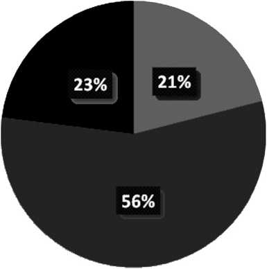 Анализ полученных результатов показал, что у 23 % студентов присутствует низкий уровень рефлексии, у 56 % – средний, у 21 % – высокий (Рисунок 1).