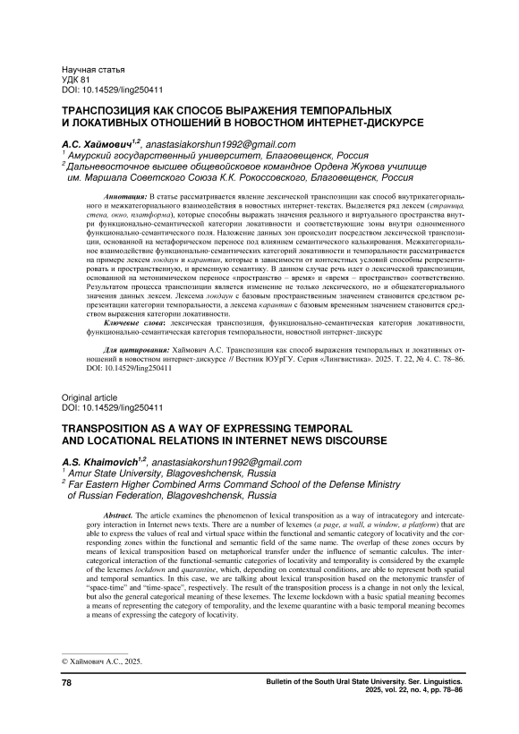 В статье рассматривается явление лексической транспозиции как способ внутрикатегориального и межкатегориального взаимодействия в новостных интернет-текстах. Выделяется ряд лексем (страница, стена, окно, платформа), которые способны выражать значения реального и виртуального пространства внутри функционально-семантической категории локативности и соответствующие зоны внутри одноименного функционально-семантического поля. Наложение данных зон происходит посредством лексической транспозиции, основанной на метафорическом переносе под влиянием семантического калькирования. Межкатегориальное взаимодействие функционально-семантических категорий локативности и темпоральности рассматривается на примере лексем локдаун и карантин, которые в зависимости от контекстных условий способны репрезентировать и пространственную, и временную семантику. В данном случае речь идет о лексической транспозиции, основанной на метонимическом переносе «пространство – время» и «время – пространство» соответственно. Результатом процесса транспозиции является изменение не только лексического, но и общекатегориального значения данных лексем. Лексема локдаун с базовым пространственным значением становится средством репрезентации категории темпоральности, а лексема карантин с базовым временным значением становится средством выражения категории локативности.