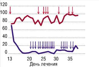 Рис. 1. Переливание эритроцитов и тромбоцитов, динамика концентрации гемоглобина и тромбоцитов.