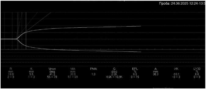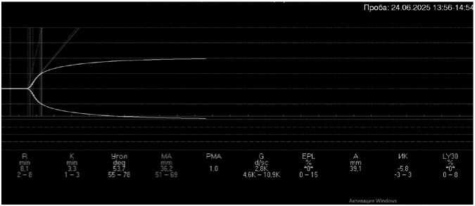 Рис. 2. ТЭГ до переливания тромбоцитов 24.06.2025.