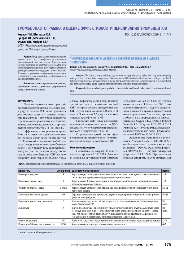 Текст научной статьи Тромбоэластограмма в оценке эффективности переливания тромбоцитов