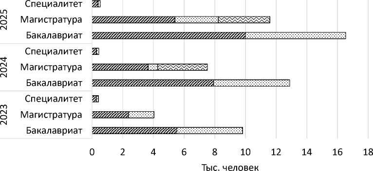 Согласно полученным данным, выпуск в рамках ОПОП высшего образования в сфере ИИ составил 20,8 тыс. выпускников (из которых 18,5 тыс. - по очной форме обучения). Годом ранее объем выпуска составлял 14,3 тыс. человек. В 2025 году плановый показатель выпуска составит уже 28,6 тыс. человек, что позволяет говорить о тренде на увеличение объема выпуска специалистов в сфере ИИ. На рис. 1 указанные показатели объема выпуска по ОПОП ВО в сфере ИИ с 2023 по 2025 годы визуализированы в разрезе уровней высшего образования и источника подготовки8.